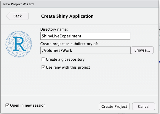 The first step is to start a new shiny project. For this one, I will use renv as the documents suggest this to be useful. The New project dialog can be used to accomplish nearly all of this.